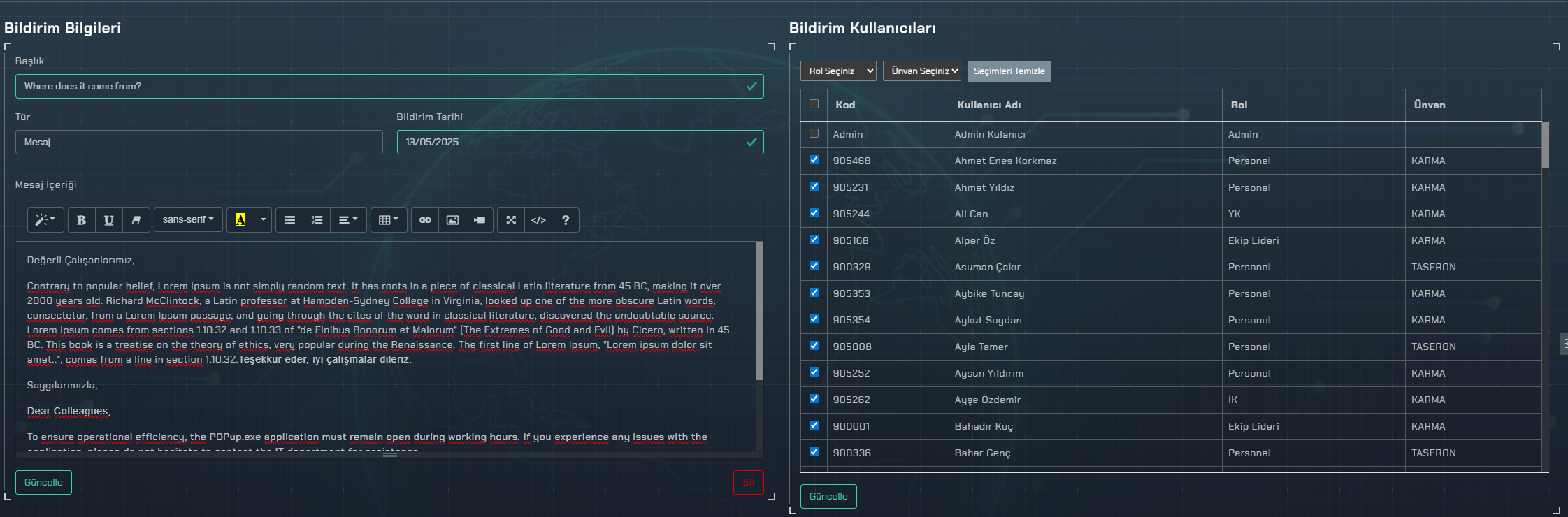 Karma Bildirim Merkezi, kurum içi iletişimi güçlendirmek ve çalışan geri bildirimlerini etkin biçimde toplamak için geliştirilmiş kapsamlı bir modüldür. Kullanıcılarınızla anlık iletişim kurabilir, duyurular, açık uçlu sorular veya anketlerle katılımı artırabilirsiniz.