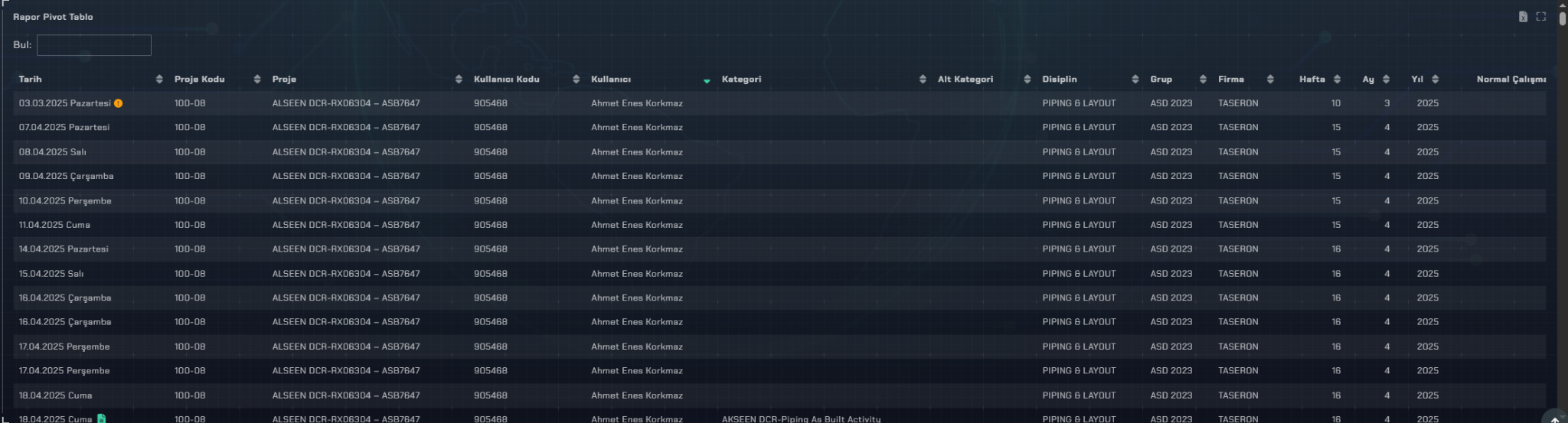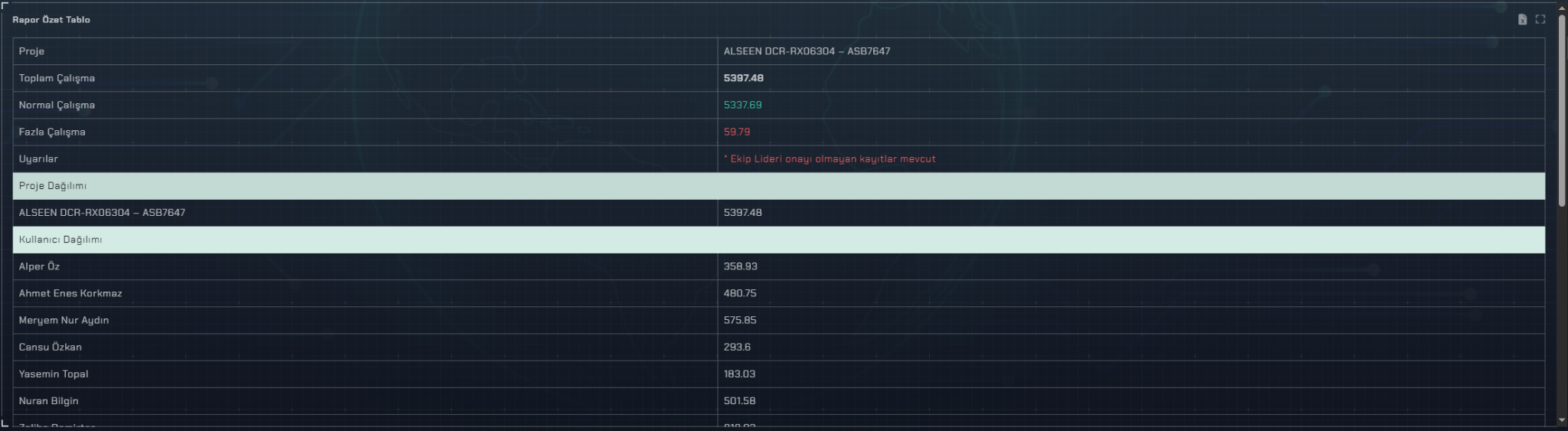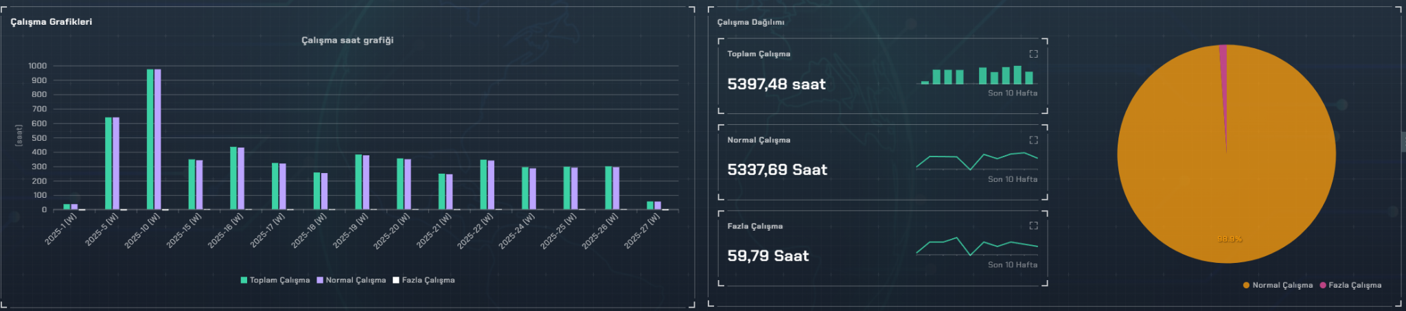 Toplam çalışma, normal çalışma ve fazla çalışma gibi kategoriler haftalık bazda grafiklerle sunulur. Bu sayede hangi haftalarda yoğunluk yaşandığı veya azalma olduğu kolayca analiz edilebilir.