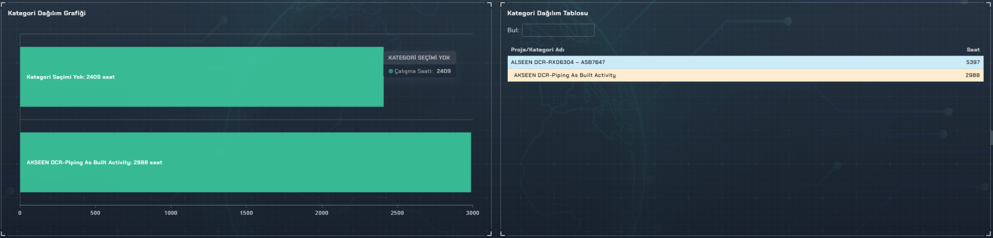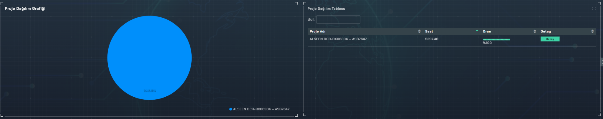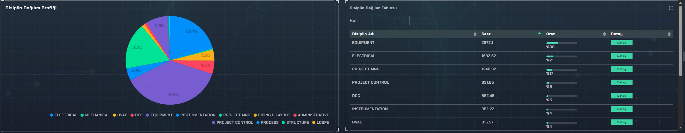 Her bir projenin toplam saat içindeki oranı grafiksel olarak gösterilir. Aynı zamanda hangi disiplinlerin daha fazla zaman harcadığı detaylı tablolarla ve dairesel grafiklerle analiz edilir.