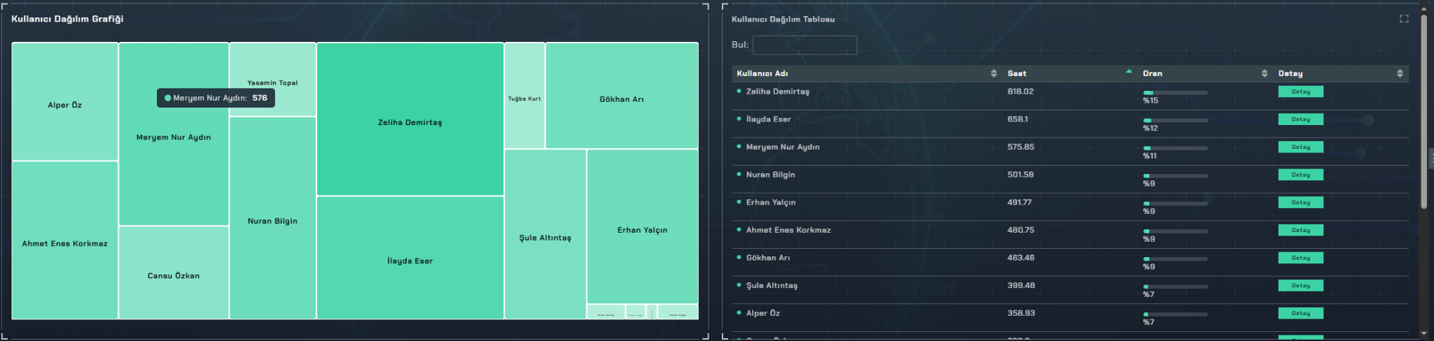 Her kullanıcının projeye harcadığı saat, yüzdesel olarak gösterilir. Görsel temsiliyet sayesinde ekip içi performans farklılıkları net bir şekilde gözlemlenir.