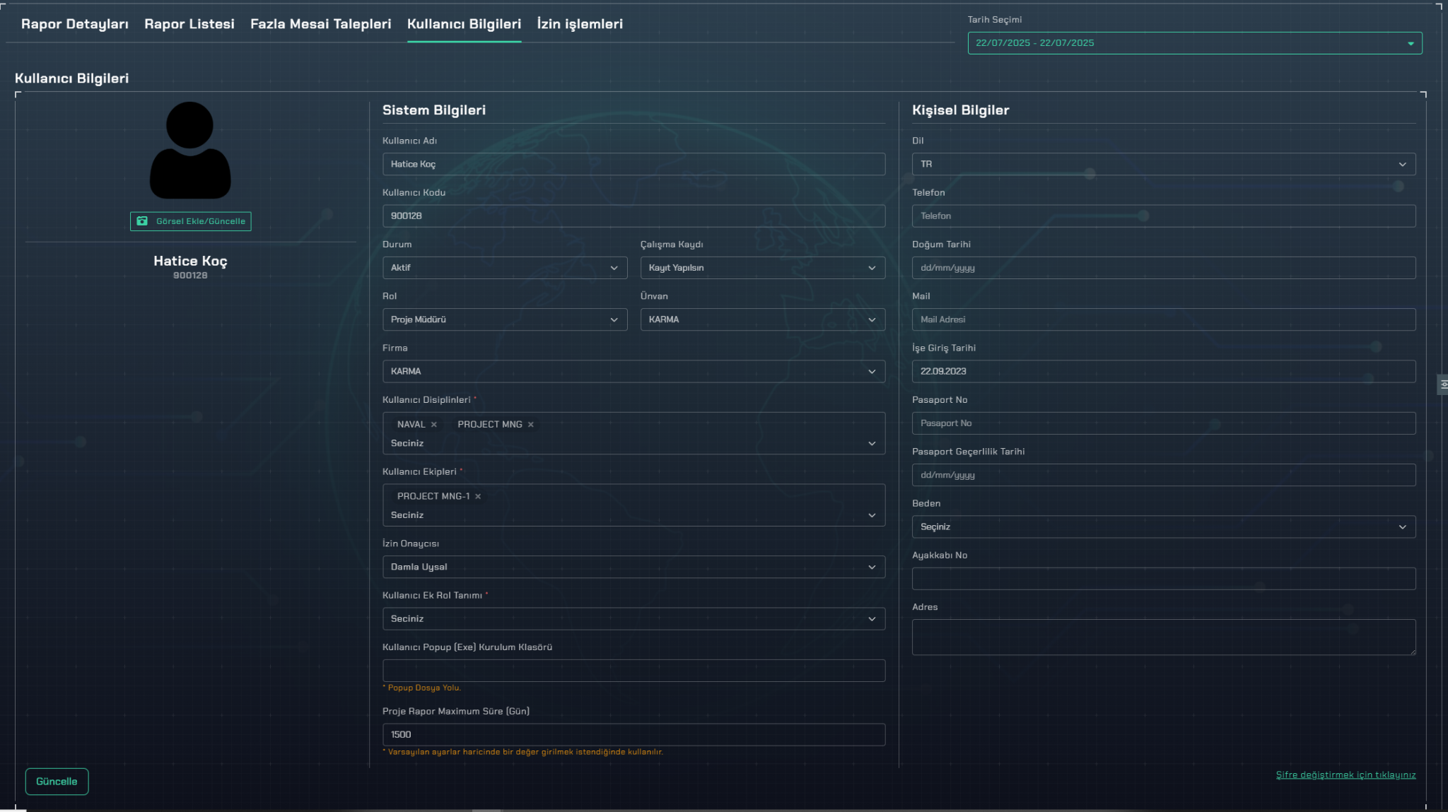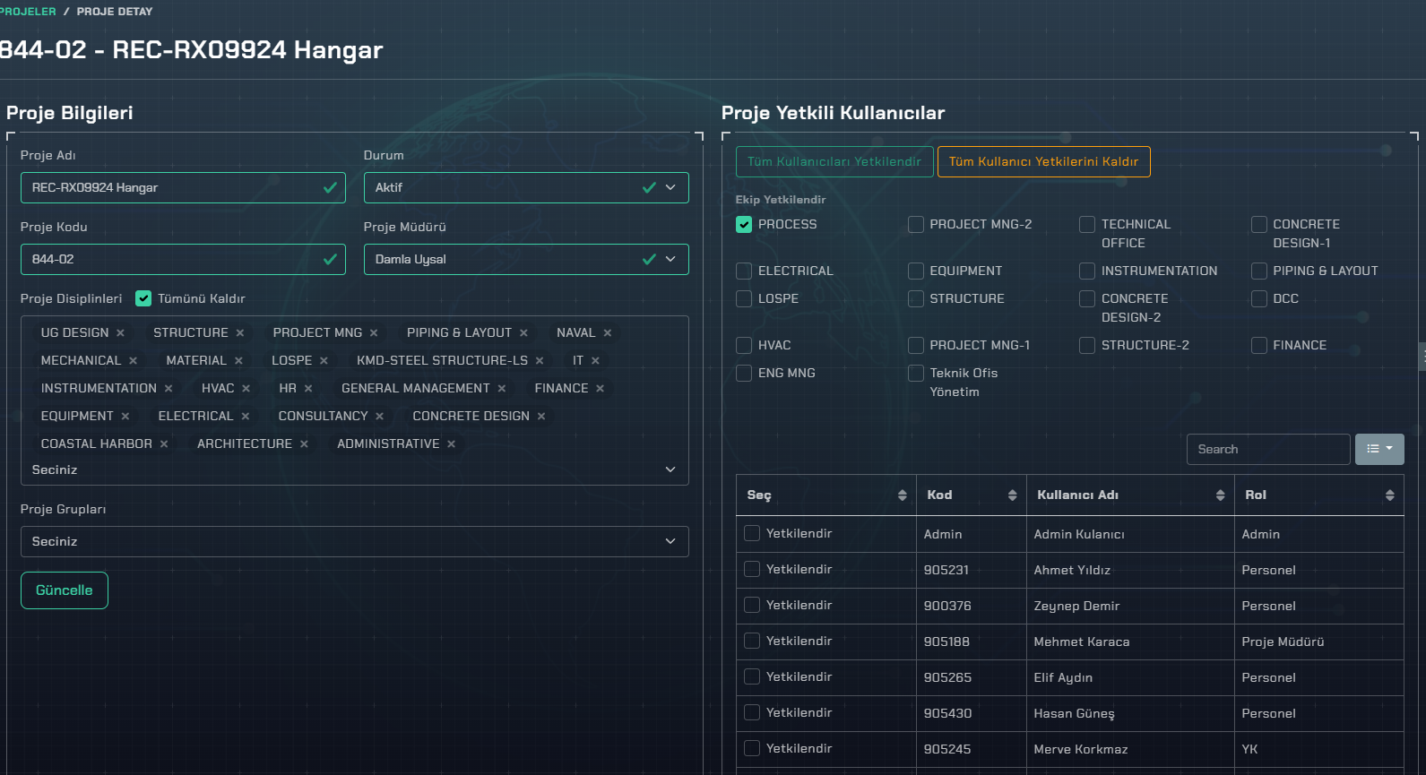 Ayrıca hem kullanıcılar hem projeler için disiplin seçimi yapılabilir. Kullanıcının sadece kendi disiplinine ait raporları oluşturabilmesi sağlanır. Bu da sistemde hatalı rapor girişlerinin büyük ölçüde önüne geçer.